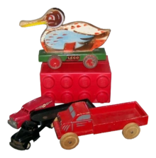 Four early LEGO wood toys with a later LEGO brick.